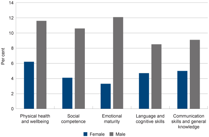 A significantly higher proportion of male than female children were vulnerable across all domains.